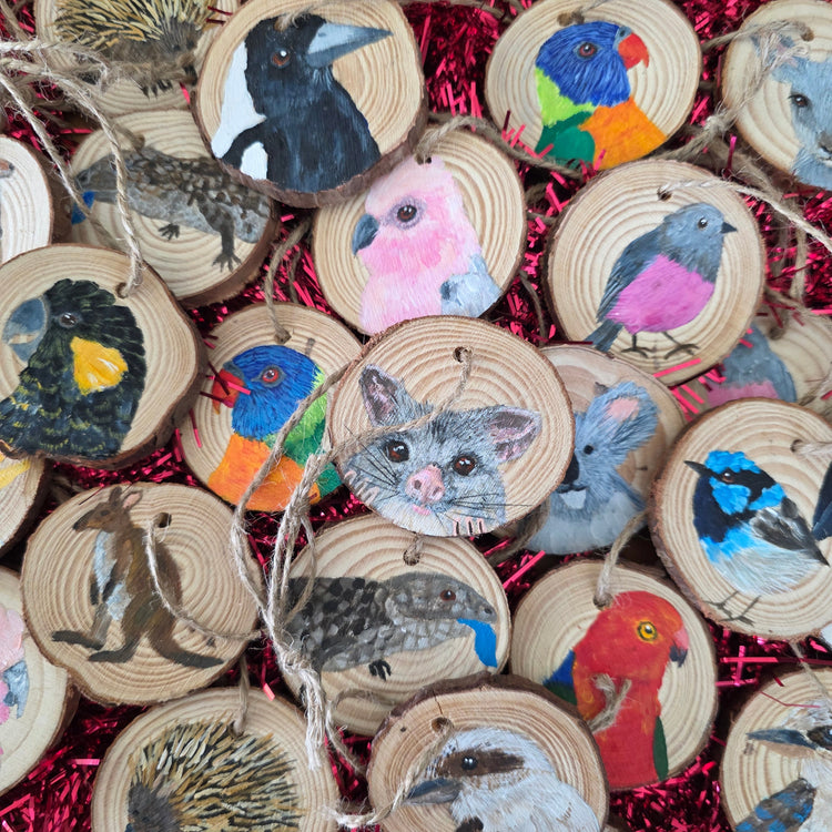 Bring a touch of nature to your festive season with these unique, hand-painted Christmas decorations. Each piece features a beautifully detailed Australian wildlife design, painted with care onto natural wood slices (approx. 5–6 cm).