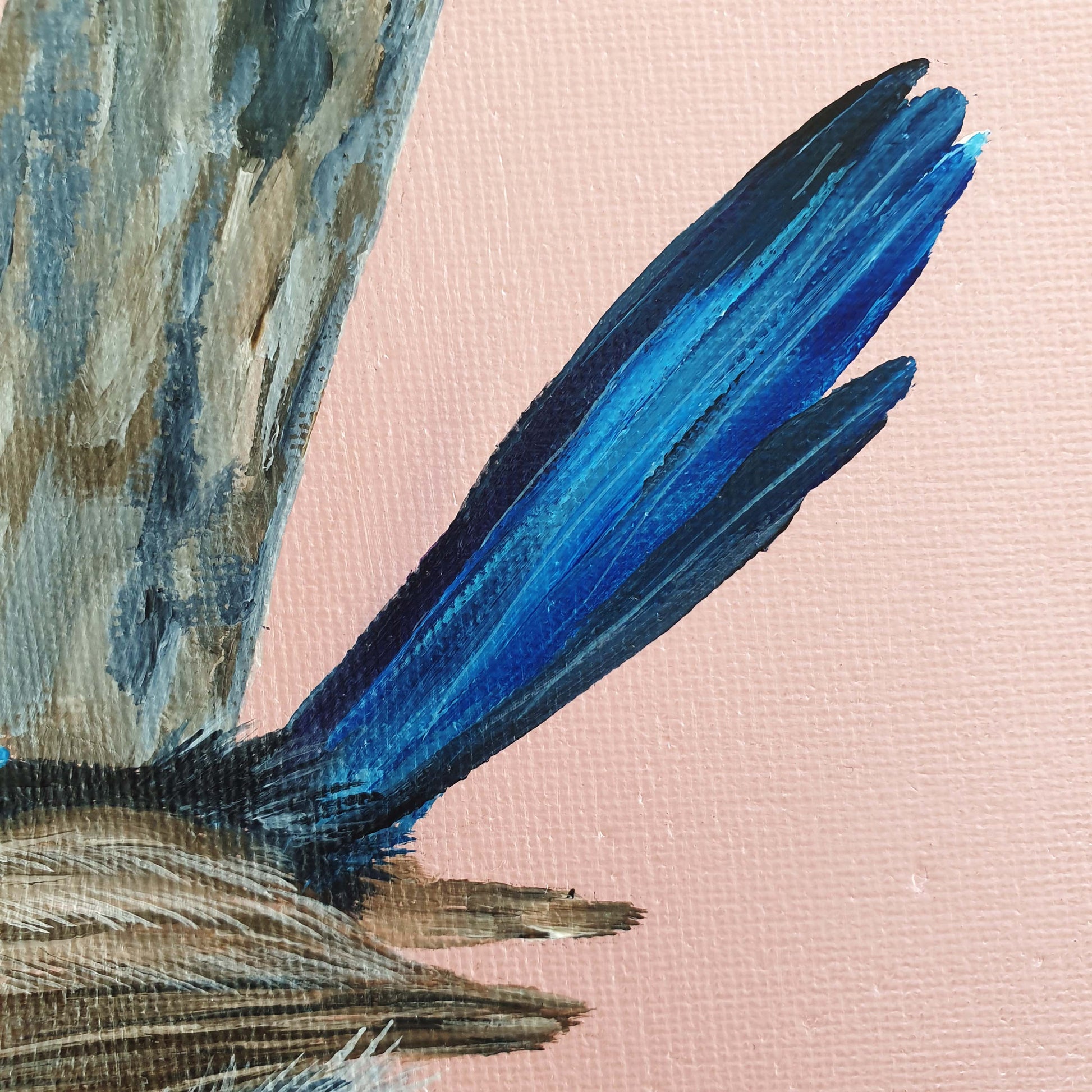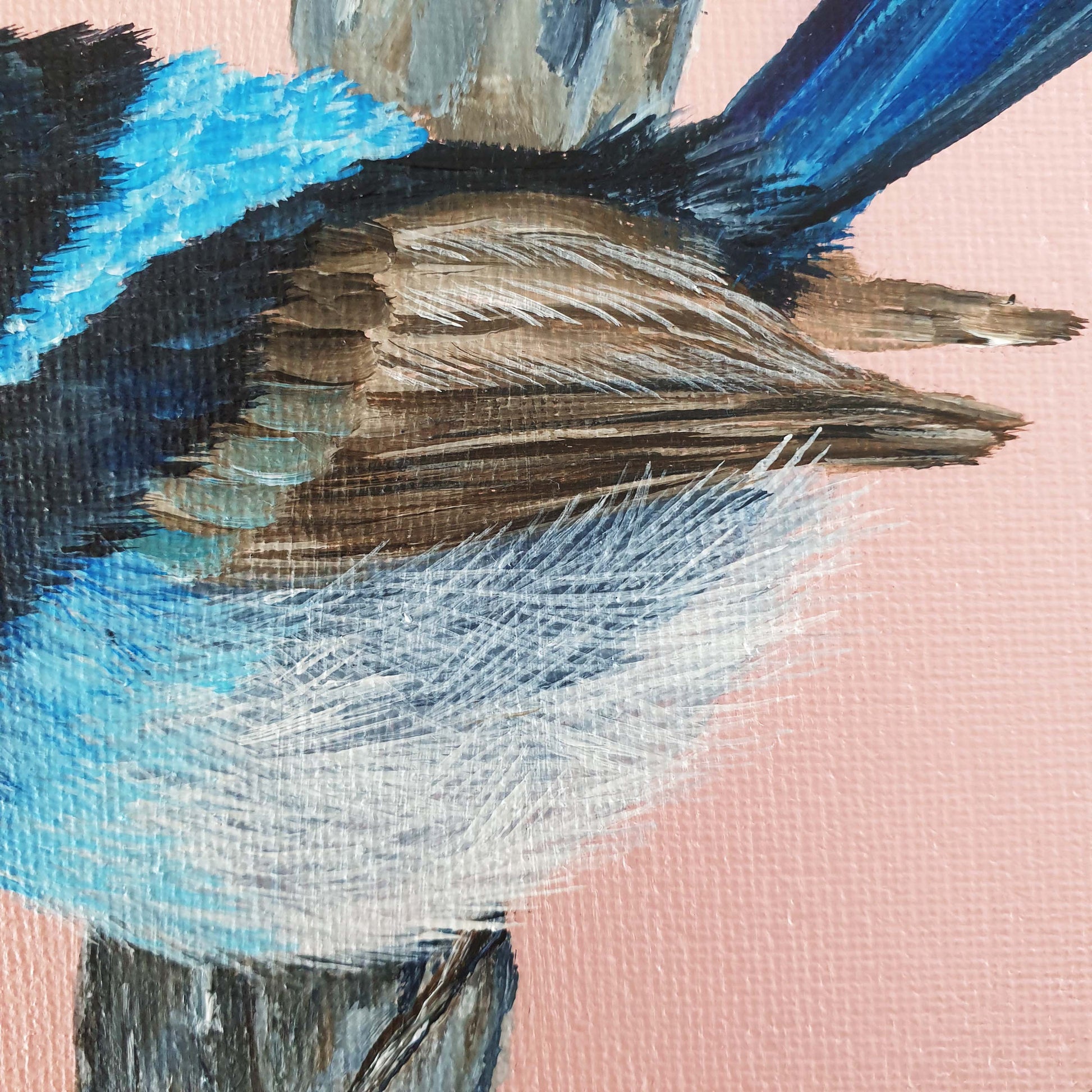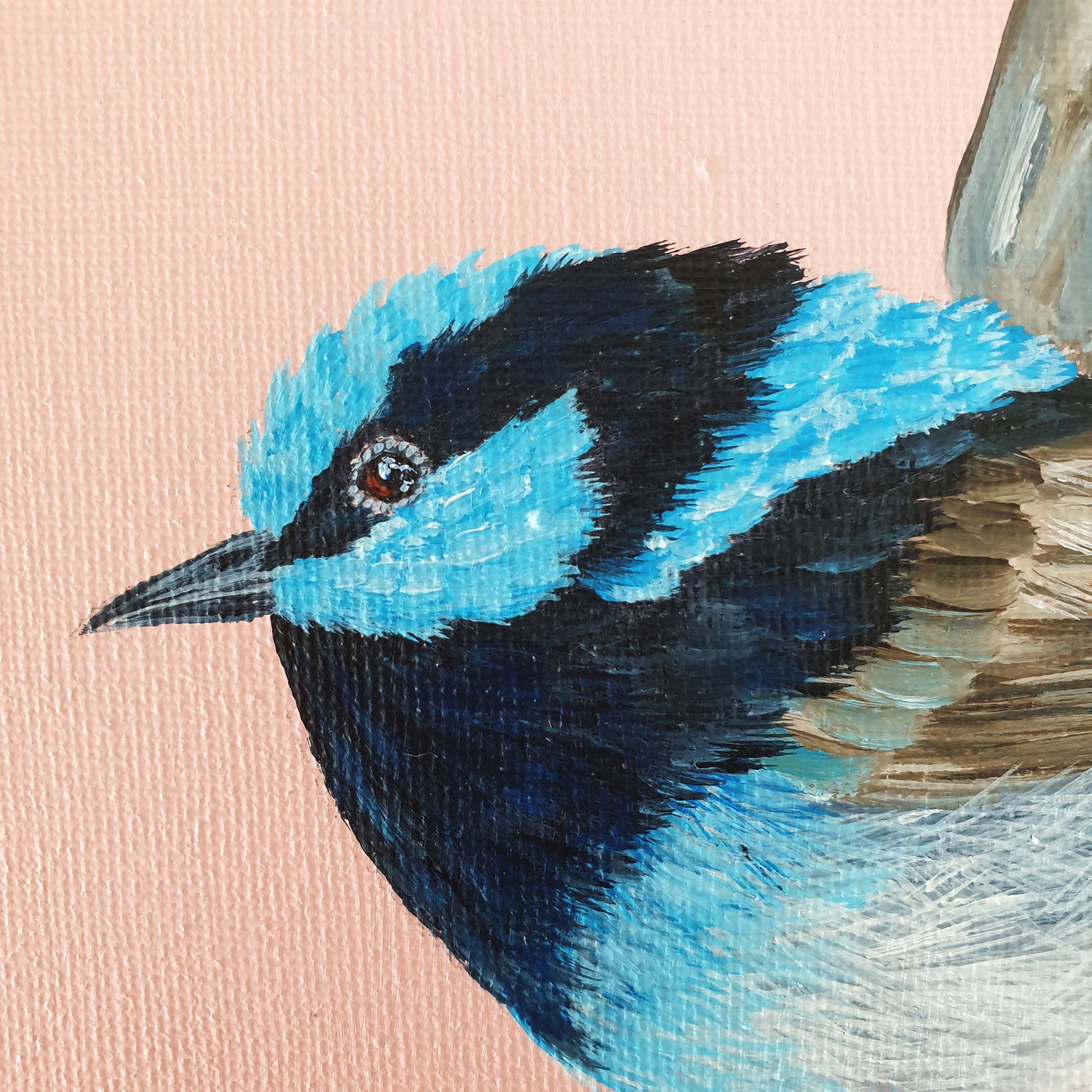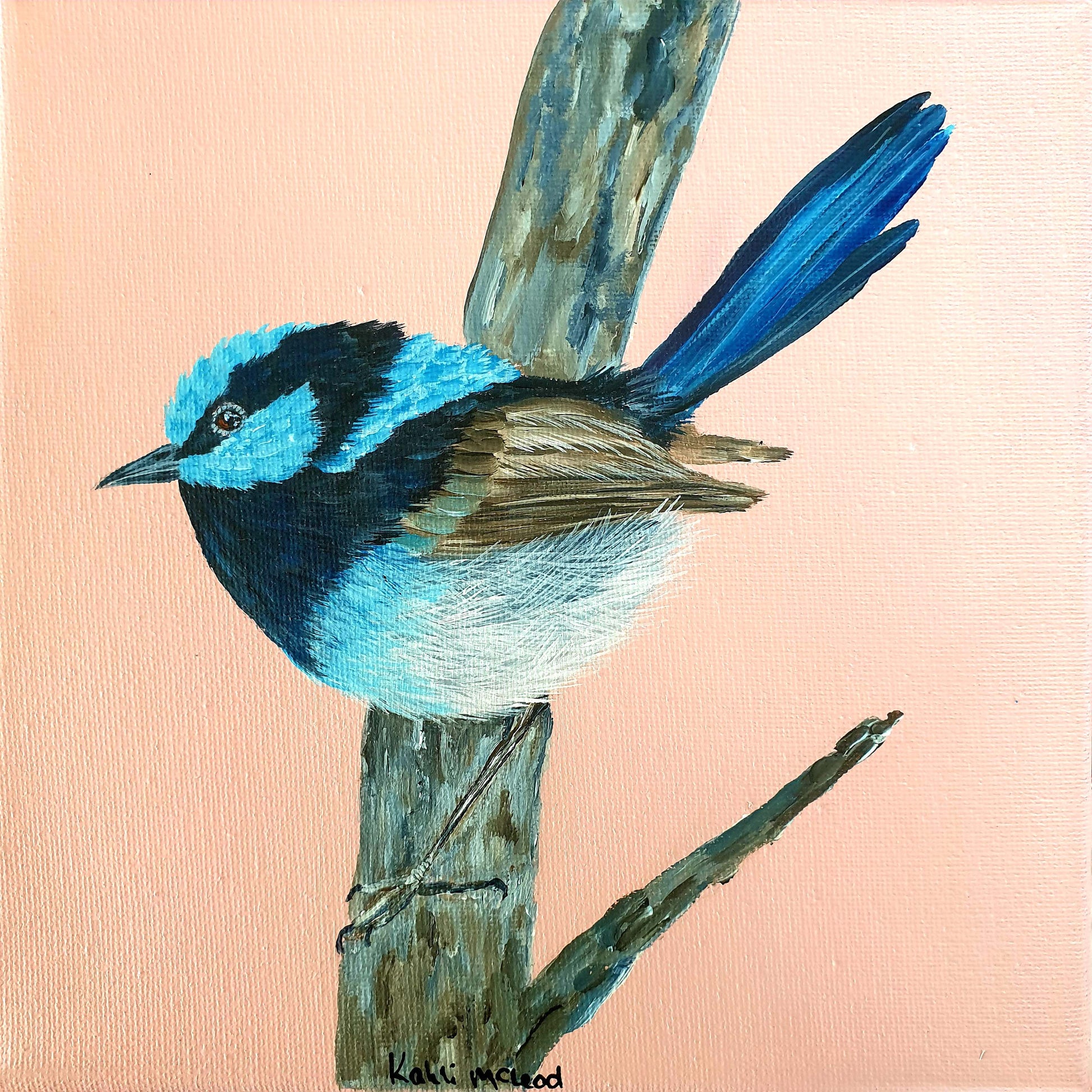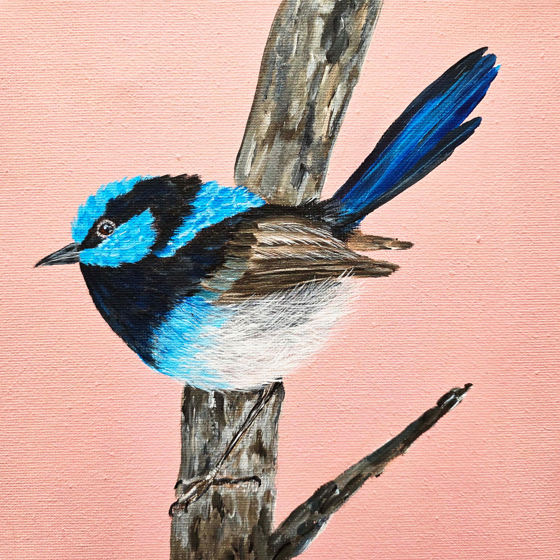 This little blue wren brings a burst of colour, perched on a simple branch against a soft pink background. I love the contrast between the bird’s bright blues and the warm, playful backdrop—it’s a calm, eye-catching work that adds a splash of joy to any space.