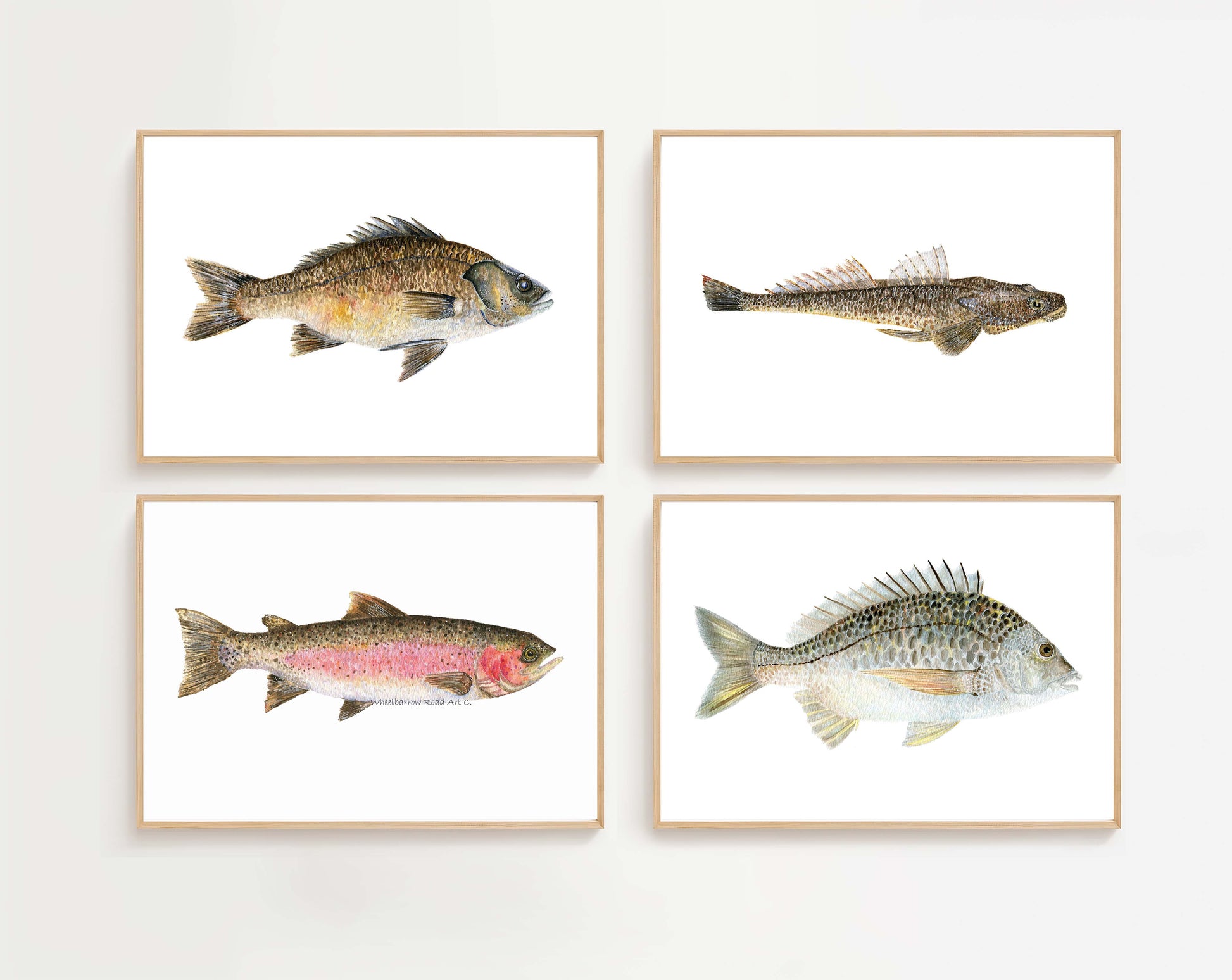 These prints are from my best selling original hand painted watercolour fish collection. This set of four prints has been popular for gifting and in professional spaces. The prints come in a set of four you can choose from two sizes A4 21 x29.7cm or A3 29.7x42cm both are Landscape orientation. The Australian fish featured are the bass, flathead, rainbow trout and bream. Prints are archival quality handmade by me every step of the way in my studio located in Braidwood.