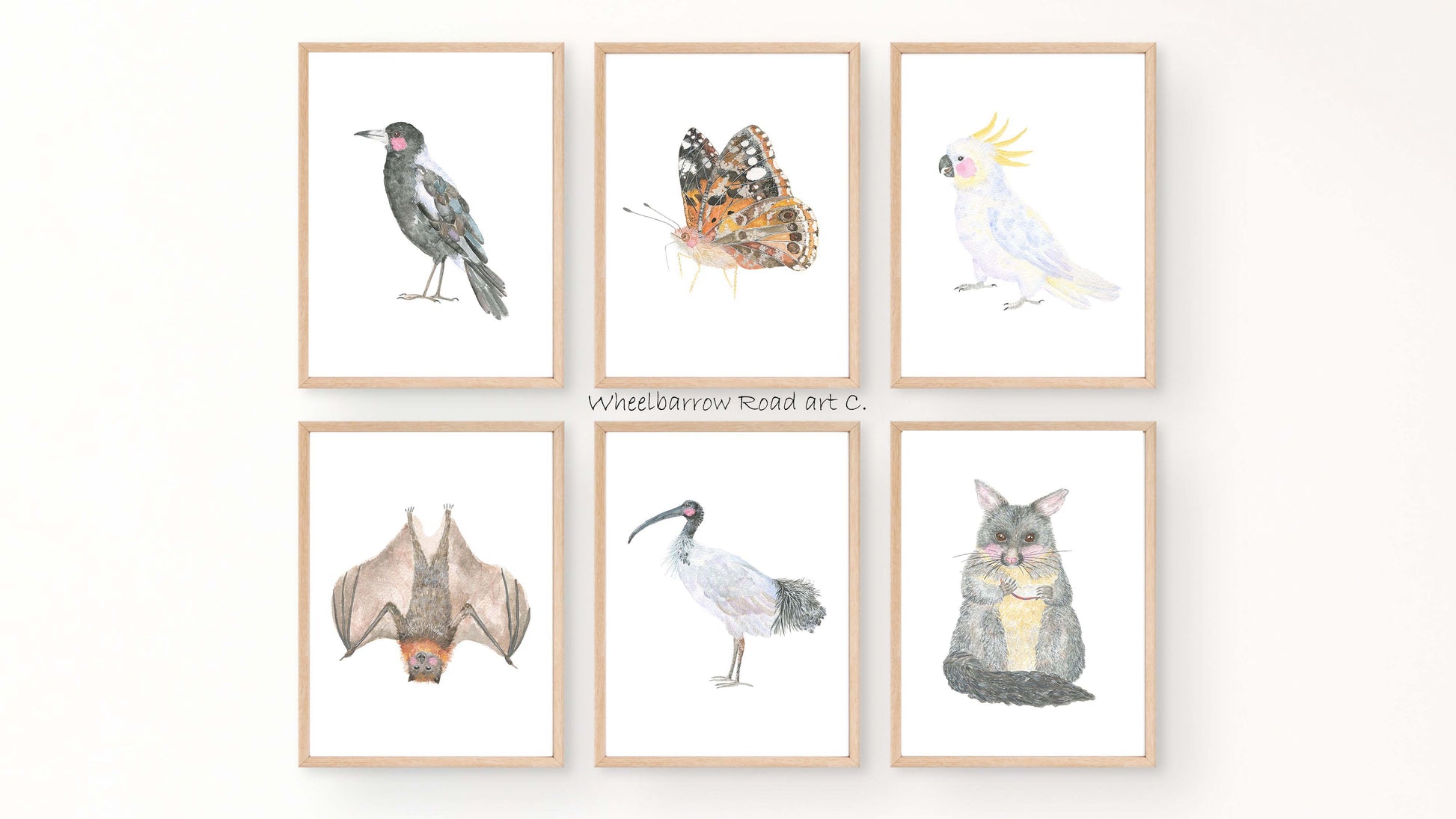 This collection features some of Australia’s best-known animals the Magpie, Painted Lady Butterfly, Fruit bat, Ibis aka bin chicken, Cockatoo and brush-tailed possum. Every animal has been hand painted by myself using watercolour and gouache. My original painting is then reproduced for you using archival quality products to produce high quality art prints for you to enjoy or gift. Every process from start to finish is completed by me in my art studio in rural Australia. My hope is that this artwork sparks curiosity and conversations as your child grows about our native wildlife. What Australian Animal might you see next?