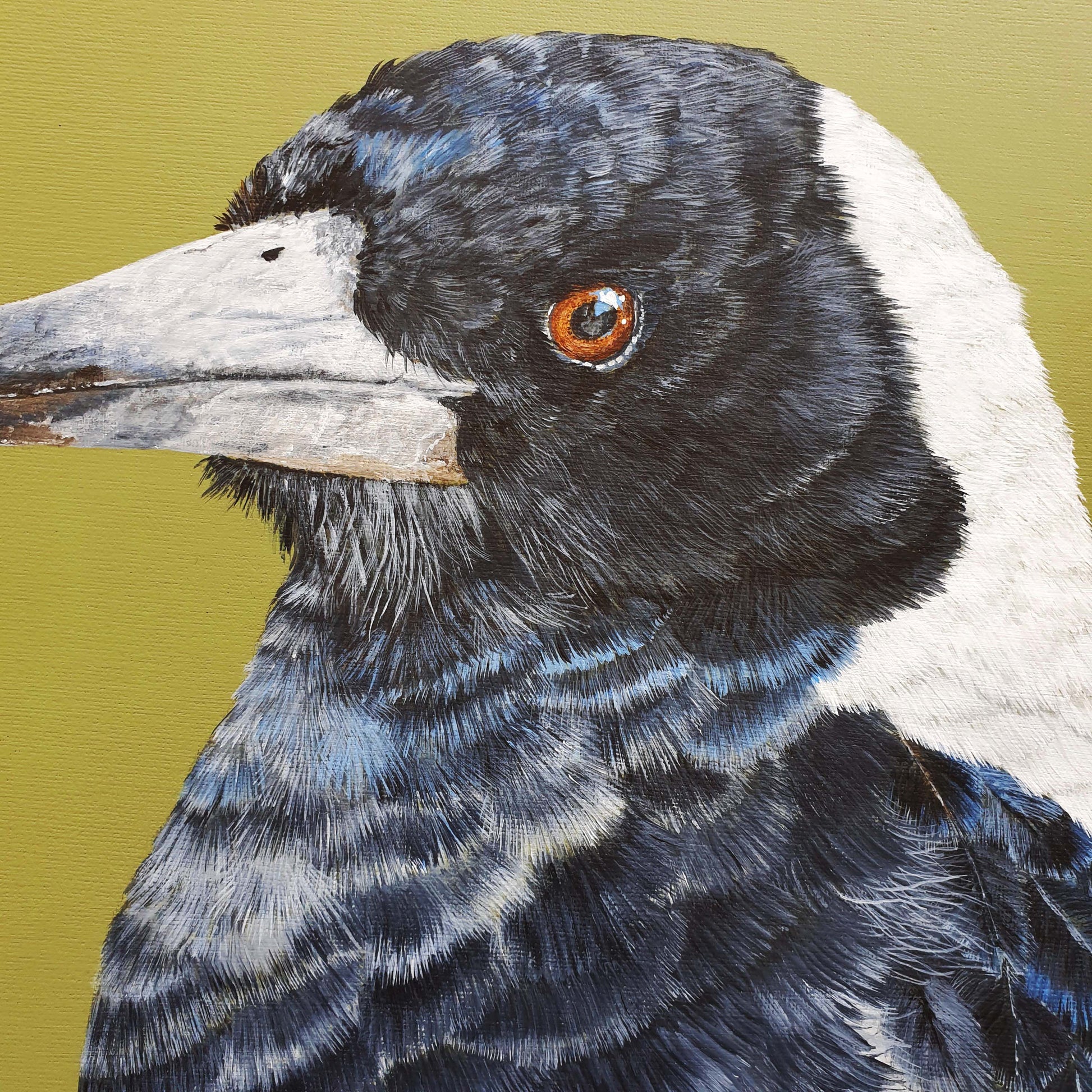 A bold bust portrait of the Australian Magpie, capturing its sharp intelligence and striking presence. Painted in crisp black and white against an earthy olive green background, this piece brings a modern edge to a beloved native bird.