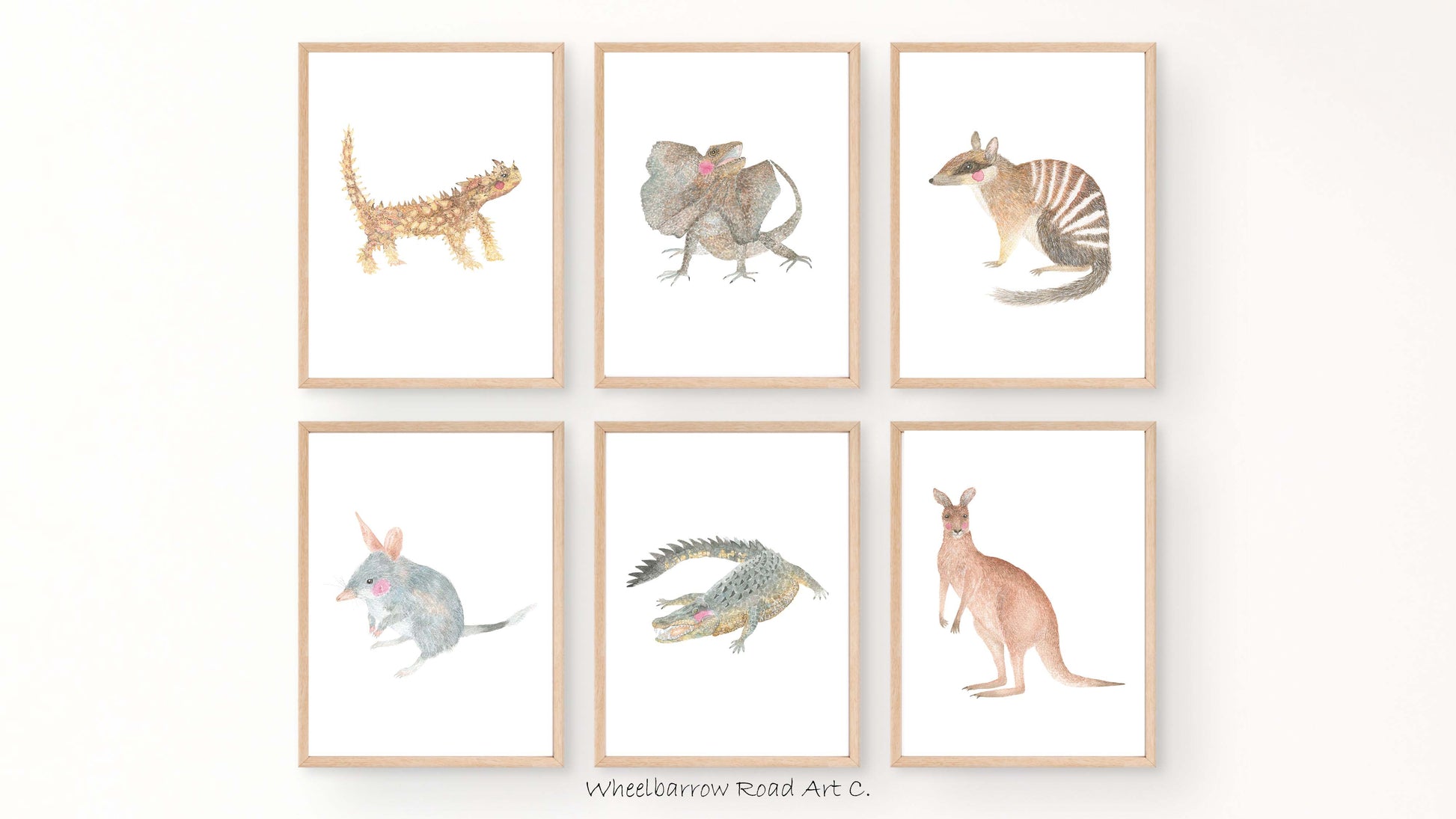 This collection features some of Australia’s best-known animals the Numbat, Thorny Devil, Red Kangaroo, Bilby, Crocodile and Frilled-Neck Lizard. Every animal has been hand painted by myself using watercolour and gouache. My original painting is then reproduced for you using archival quality products to produce high quality art prints for you to enjoy or gift. Every process from start to finish is completed by me in my art studio in rural Australia. My hope is that this artwork sparks curiosity and conversations as your child grows about our native wildlife. What Australian Animal might you see next?
